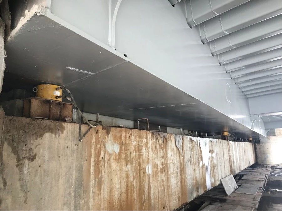 采用分級頂升的方式,直到開啟橋跨梁體與臨時支撐完全脫空狀態(tài),在該狀態(tài)下為梁體自重完全由千斤頂承擔,計算機準確算出橋梁重量。通過準確把握橋梁的真實自重,為后續(xù)開啟裝置的定制提供科學依據(jù)。